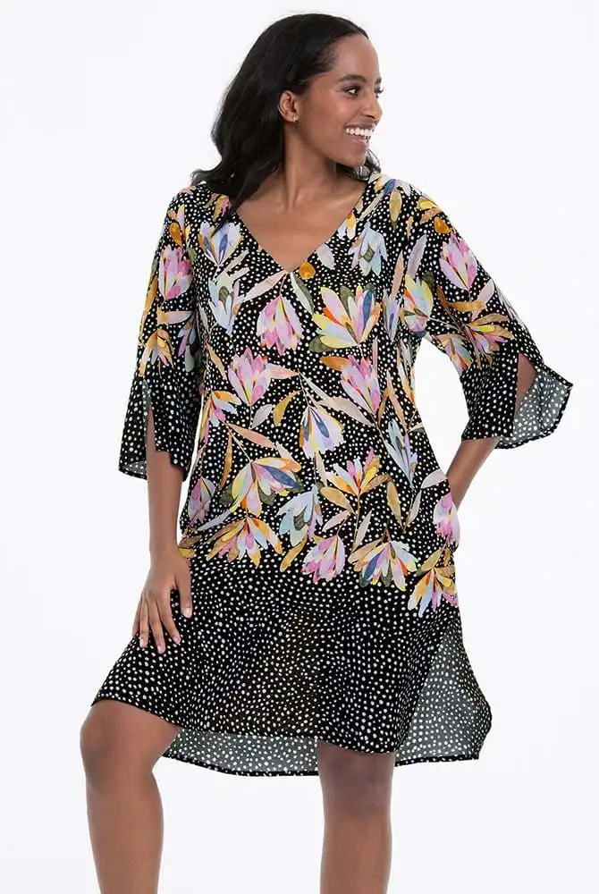 Mit Strandtunika Garda von Anita machen Sie im Urlaub alles richtig. Die elegant geblümte Tunika Garda präsentiert sich optimal zu Ihrer Bademode in einem wunderbar femininen körperumspielenden Schnitt. Der weiche Viskose-Stoff trocknet schnell und fügt sich leicht in jedes Reisegepäck. Der gerade knielange Schnitt der wunderschönen Tunika Garda fällt luftig leicht und wird ergänzt durch halblange Ärmel. Der attraktive V-Ausschnitt akzentuiert optimal Ihr Dekolleté.