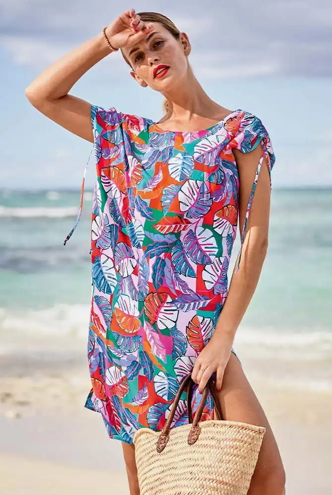 Mit einer gelungenen Farbkombination sticht unser Strandkleid Marajo sofort positiv ins Auge! Das aufregende Tropik-Design ist sowohl am Strand als auch in der City ein echter Eye-Catcher. Die seitlichen Schlitze bieten viel Bewegungsfreiheit und mit den Raffungen an den Schultern lässt sich das tropische Topic-Beachaccessoire zu verschiedenen Styles ergänzen. Praktische Eingriffstaschen an den Seiten bieten viel Platz für kleine Urlaubsouvenirs.