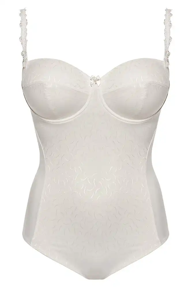 Balconette Body mit Stickerei und verzierten Außenträgern. Das dreigeteilte Schaumcup ist überzogen mit feinstem Jacquard. Die vordere Mitte des Bodys ist mit Tüll unterlegt und der Beinabschluss ist flach verarbeitet. Es werden Klarsichtträger und ein Neckholderträger mitgeliefert, die anstelle des Schmuckträgers verwendet werden können. Der Body sollte nicht ohne Träger getragen werden. Der ergonomisch geformte Bügel wird durch ein besonders weiches Bügelband abgepolstert.